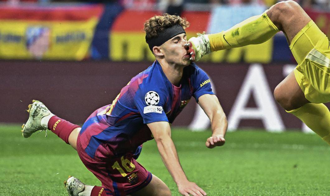 Fermín López terminó con un corte a la altura del labio, mientras que el árbitro francés Clément Turpin decidió que el partido continúe con un tiro de esquina a favor del equipo azulgrana.