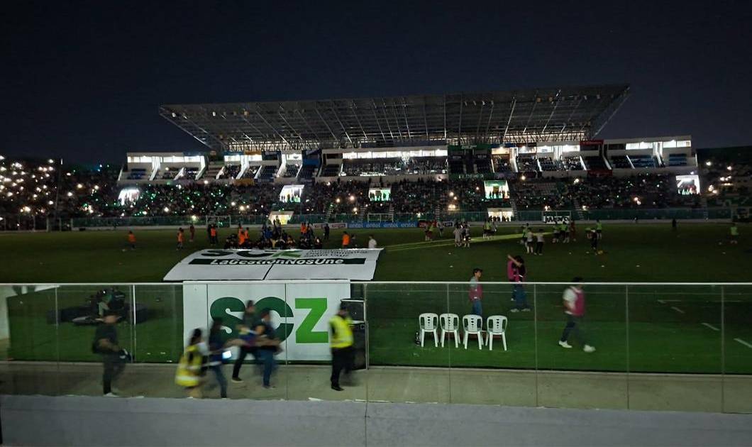 Durante el entretiempo, las luces se apagaron y el principal escenario deportivo cruceño quedó en tinieblas. Muchos pensaron que se trataba de un ‘juego de luces’, pero después de varios minutos se confirmó que se trataba de un corte eléctrico.