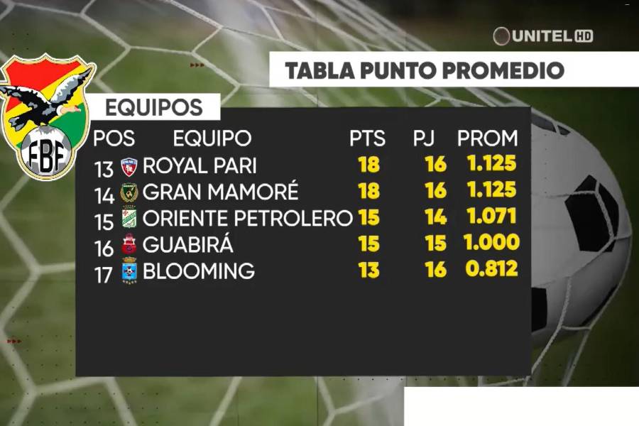 La otra novedad en el punto promedio es Guabirá, que ha caído al penúltimo lugar tras la goleada que sufrió en la Villa Imperial ante Nacional Potosí (6-0). Este año son dos los clubes que se van a segunda división por lo que los rojos de Montero están en estos momentos en zona de descenso directo.